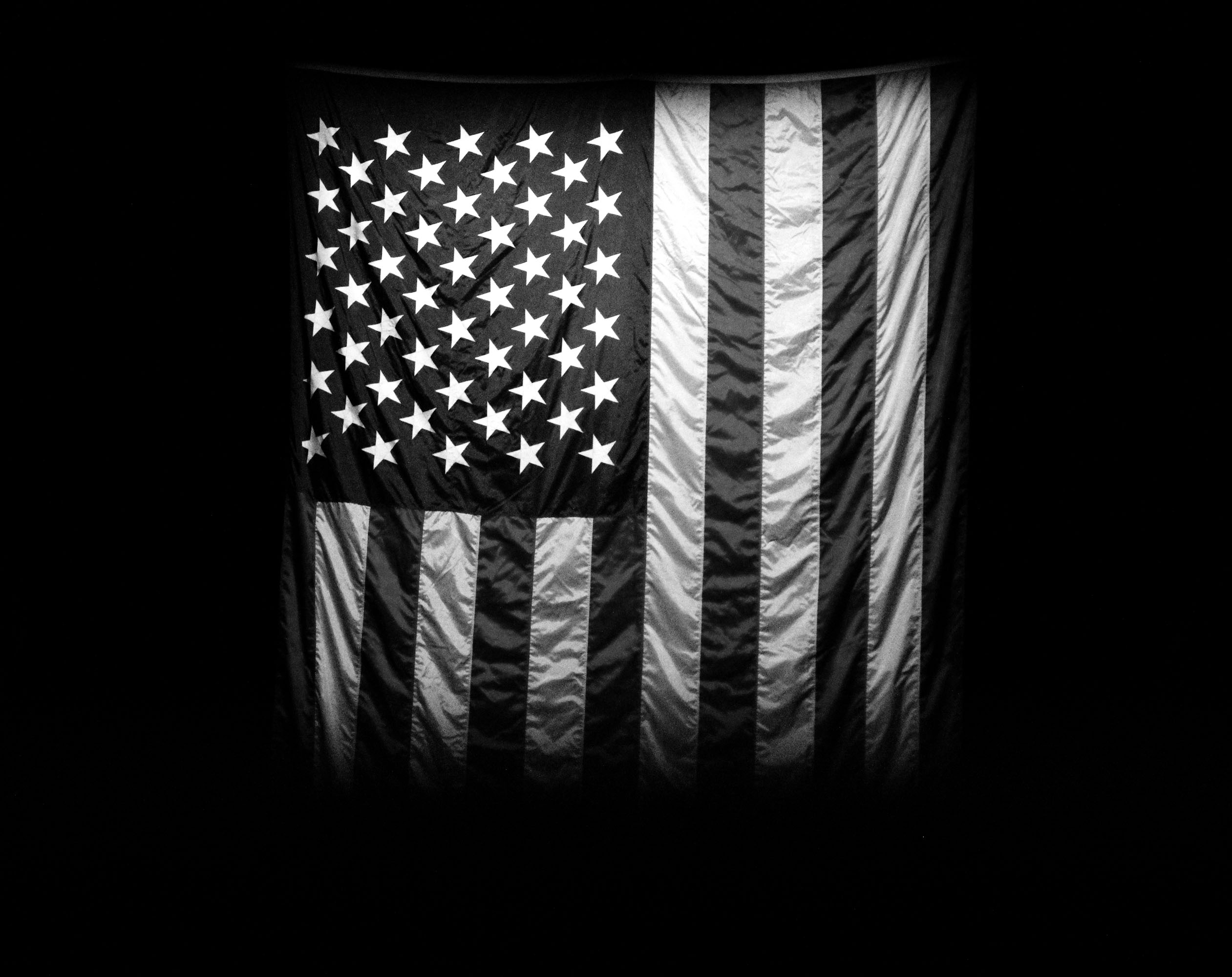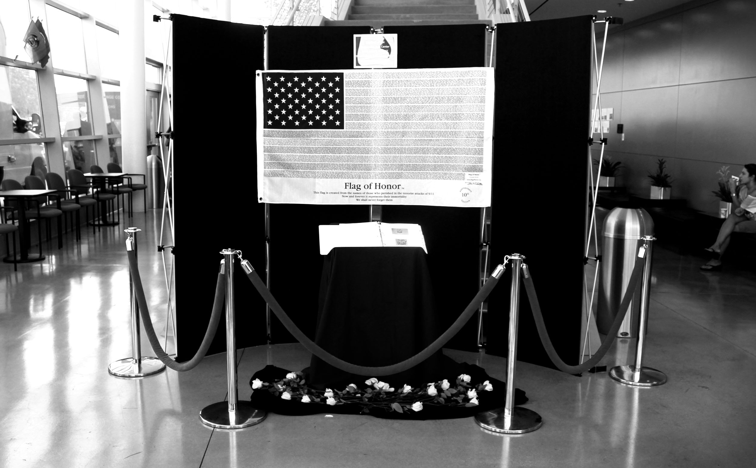 White roses piled onto the floor below a poster of the American flag that was made up of the victims’ names.