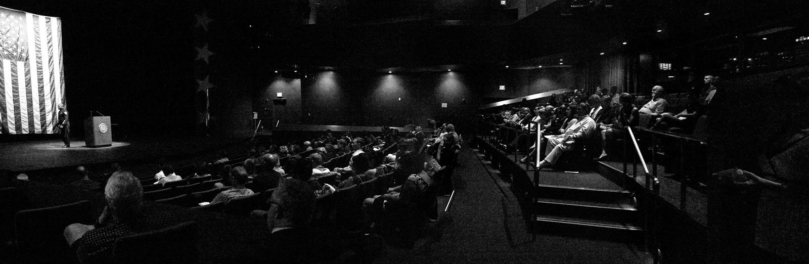 Outside the PAC, a bomb squad, emergency services personnel, police, as well as a helicopter gathered around the outside of the building, while videos from the attacks on September 11, 2001 played on large-screen TVs and photos and a timeline hung on the wall.